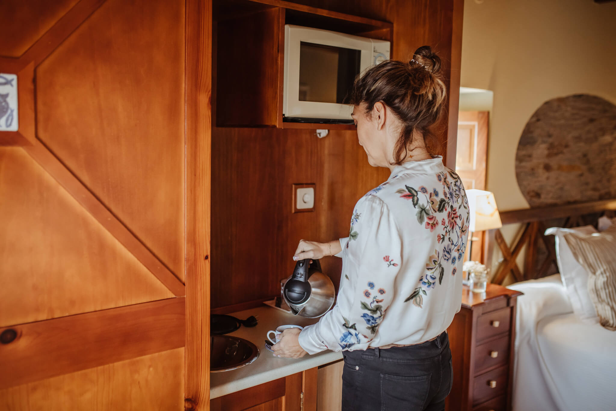 Hemos diseñado un pequeño office, dónde podrá encontrar  un microondas y minibar con bebidas e infusiones que se reponen diarimente por cortesía del hotel.